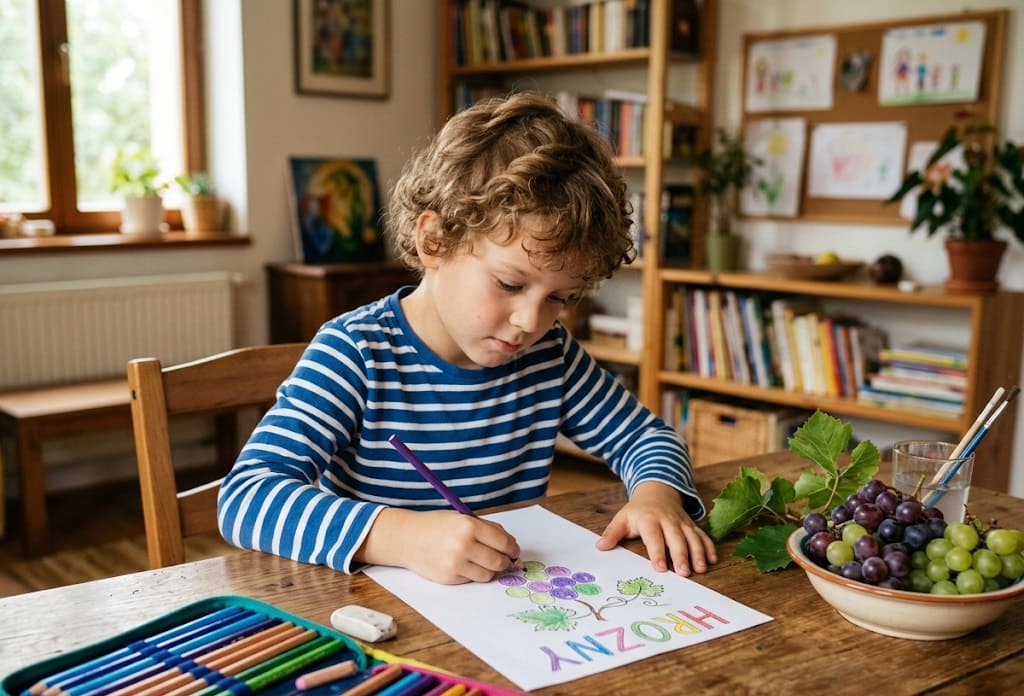 Když dítě kreslí hrozny, učí se pracovat s opakováním a strukturou. Zároveň si může hrát s barvami a vytvářet vlastní interpretaci. Neexistuje jedna správná varianta, což podporuje svobodu projevu.